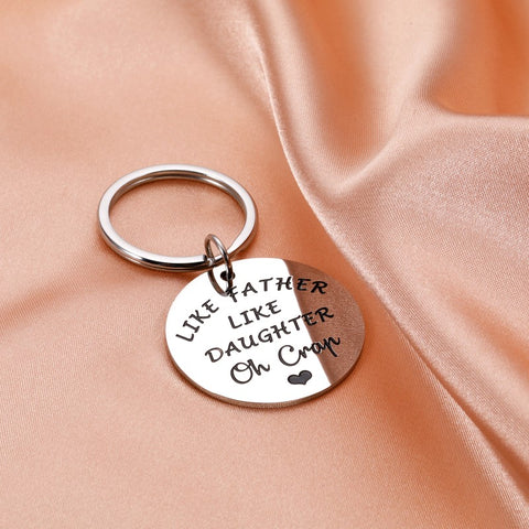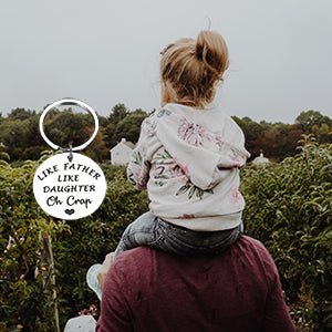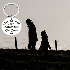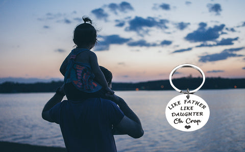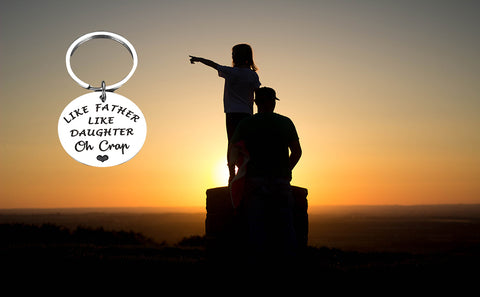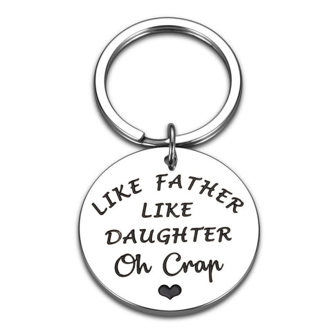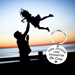 - Funny Dad Gifts from Daughter: “Like Father Like Daughter Oh Crap” Funny and humorous dad gifts perfect for dad, daddy, father, stepdad, stepfather, bonus dad, father in law, biological dad, first time dad, new dad, dad to be, papa, brother, grandpa from daughter, stepdaughter, foster daughter, family members. Imagine your dad receive this cute keychain, he definitely will laugh out loud. Great gift for dads, father daughter gifts, I love you dad gifts.