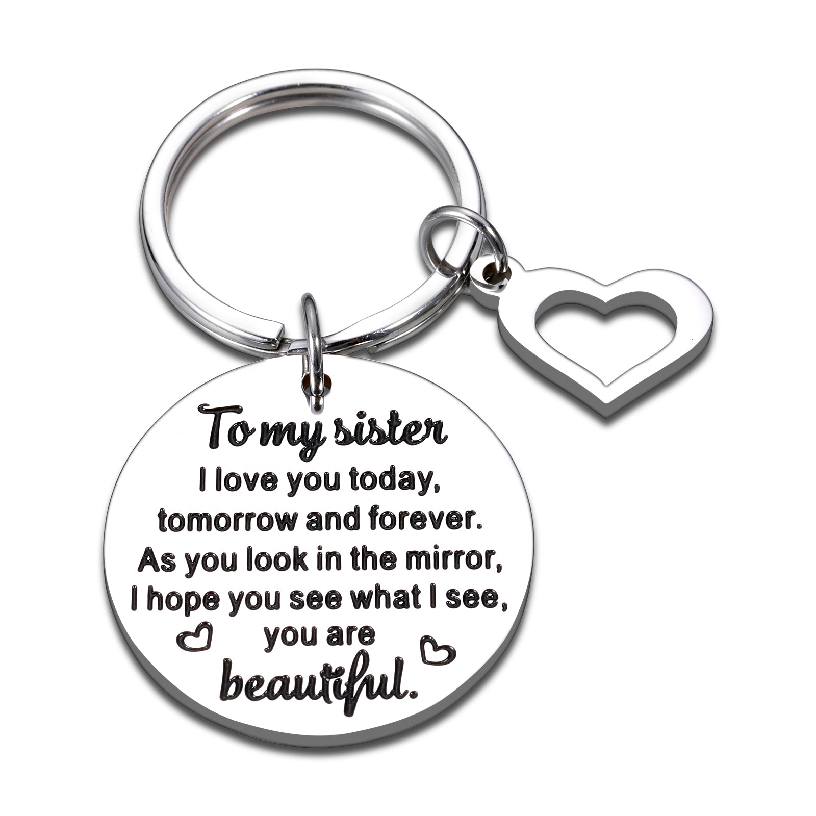 • Sister Gifts from Sister: “To my sister I love you today tomorrow and forever. As you look in the mirror, I hope you see what I see, you are beautiful.” With a lovely heart pendant, this cute gift perfect for sister, long distance sister, unbiological sister, BFF, surprise her and let her know how much you love her. Great gifts for sisters on girls weekend, girls night, national sisters day, christmas, stocking stuffers, sweet 16 18 birthday, coming of age, graduation, long distance friendship.