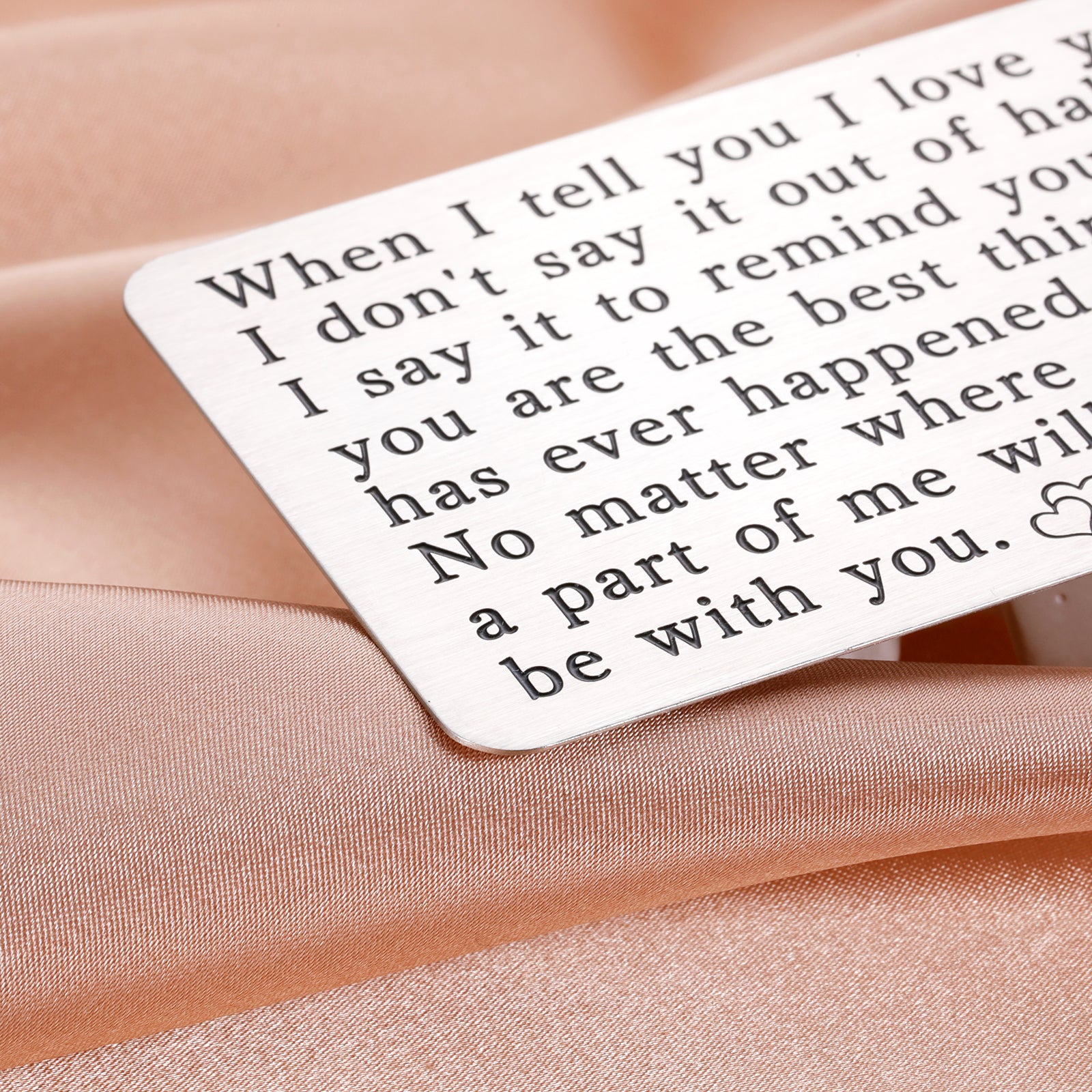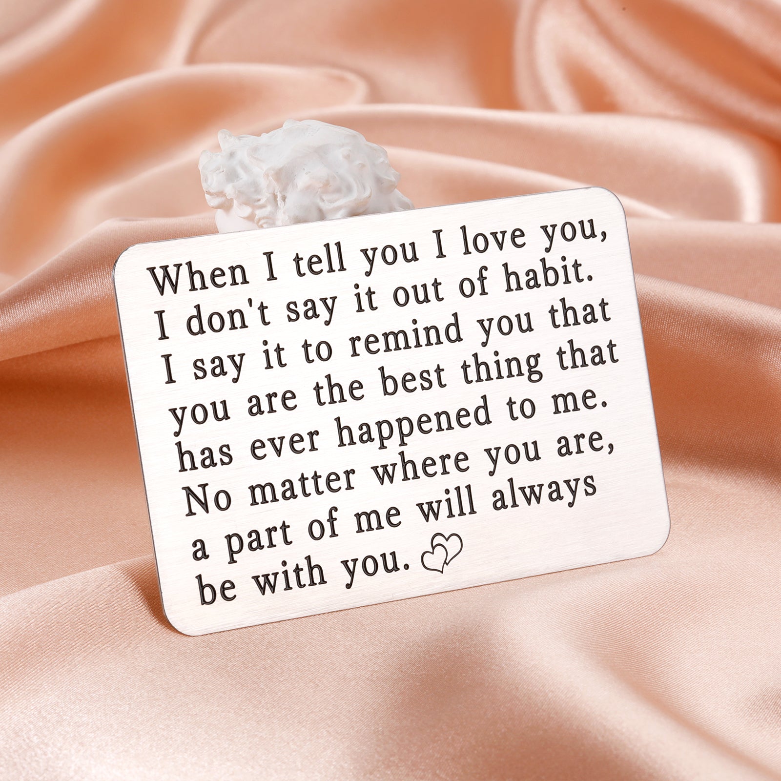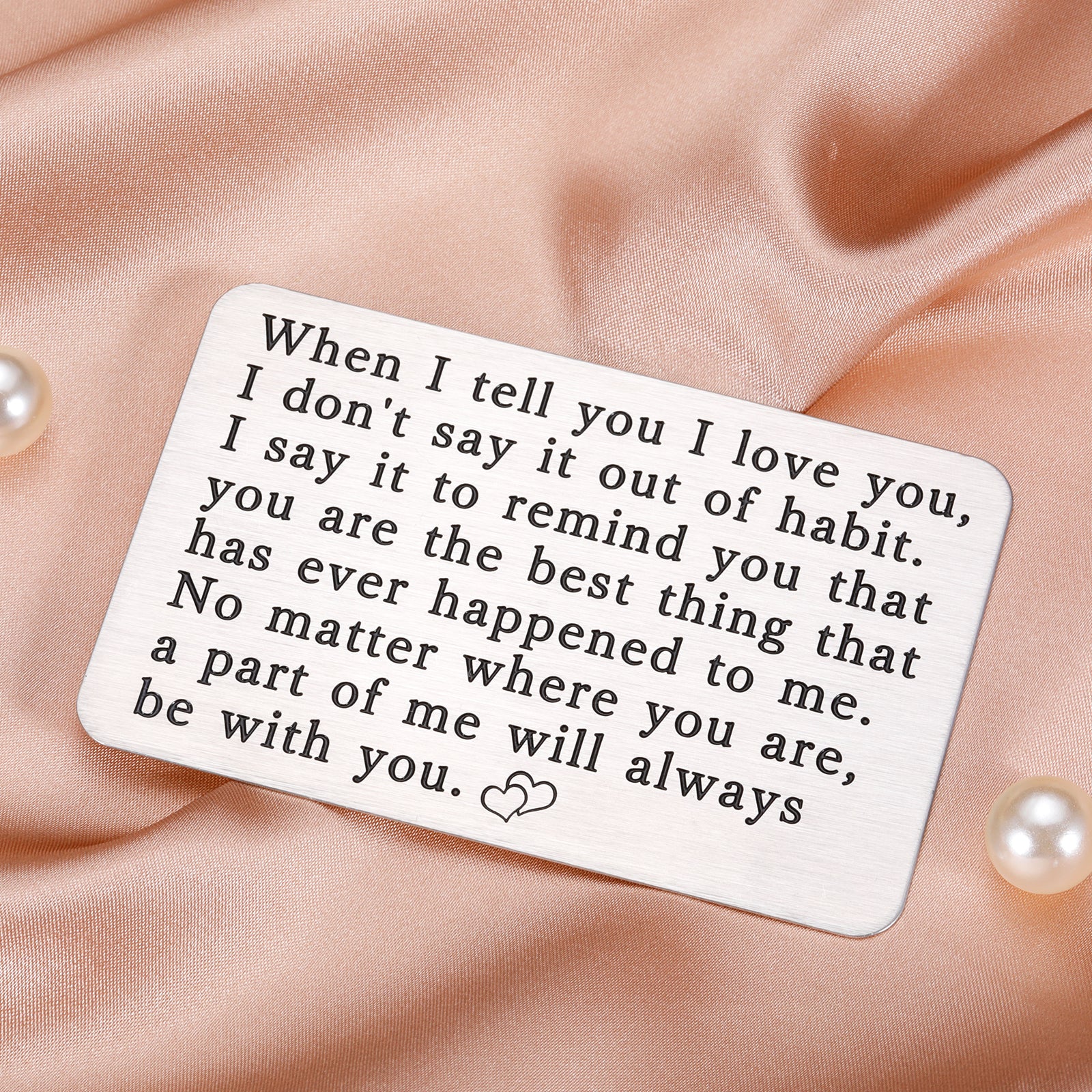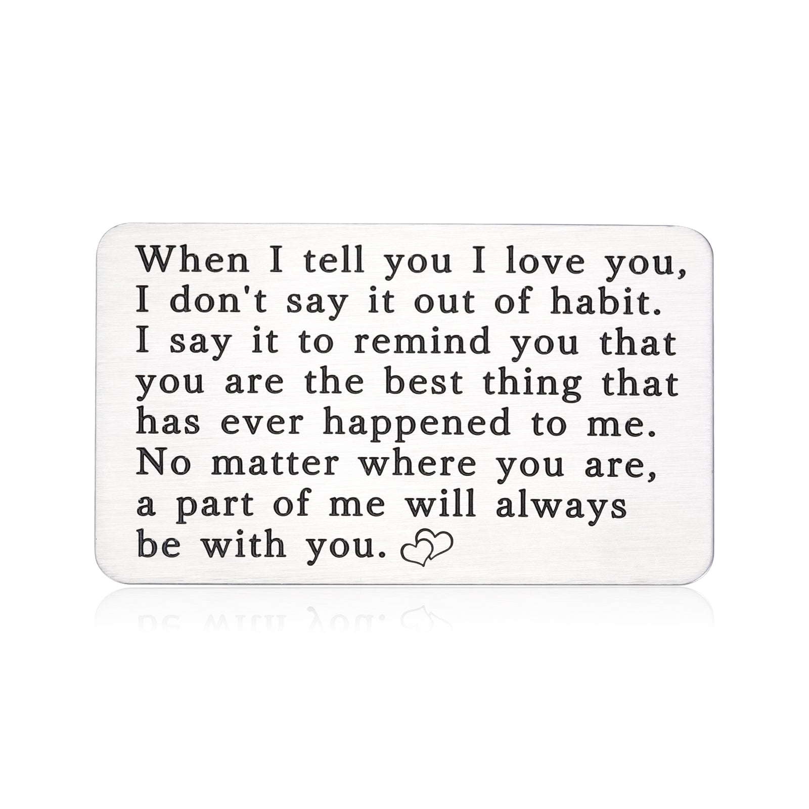 • ❣Valentines Day Gifts for Him: The meaningful wallet insert card engraved with “When I tell you I love you, I don’t say it out of habit. I say it to remind you that you are the best thing that has ever happened to me. No matter where you are, a part of me will always be with me.” Love note give it to women, men, boyfriend, husband, hubby, fiance, groom, couple on valentines day, wedding day, engagement party, sweetest day, special day. Your loved one will feel touched when he receives it.